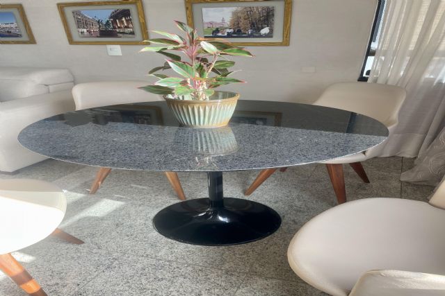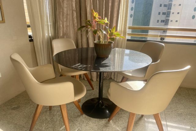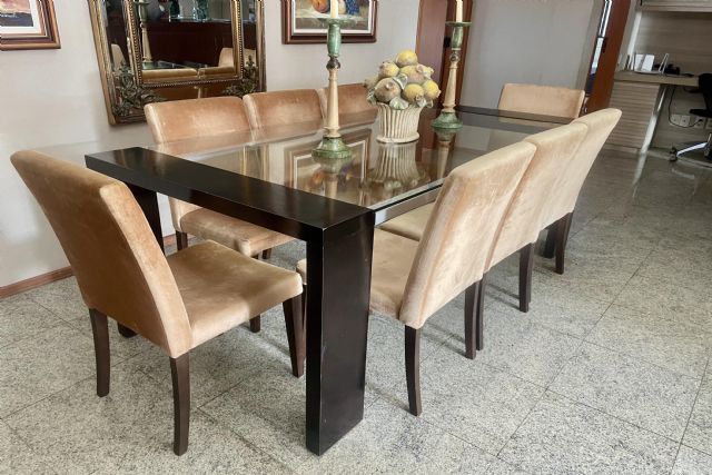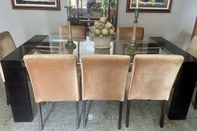 À venda, por motivo de reforma, sala de jantar com cadeiras, mesa com tampo de granito e aparador.